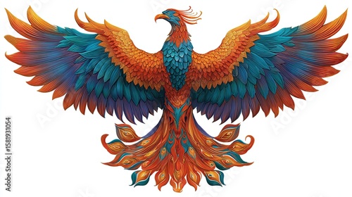 Fototapeta premium Vibrant phoenix with outstretched wings, detailed plumage in warm and cool hues