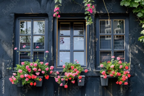 © BLQS, Fototapeta premium Vibrant Picture of Beautiful Windows with Flowers on a Black Facade House