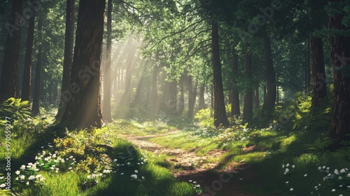 © wicha, Obraz premium vibrant pine forest with sunlight filtering through the trees.
