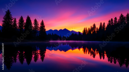 © Arthur Constantine, Fototapeta premium Vibrant Pink And Purple Sunrise Over Mountain Lake