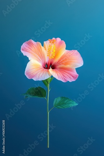 © Mandeep, Obraz premium Vibrant pink and yellow hibiscus flower against a deep blue background