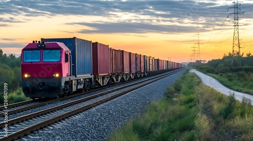 © Generative AI, Fototapeta premium Vibrant pink cargo train on railway with containers in sunset scene showcasing transportation and logistics : Generative AI