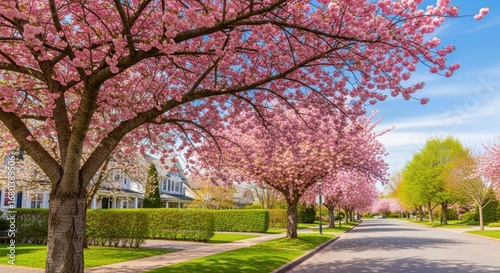© abba, Naklejka premium Vibrant pink cherry blossom trees line a picturesque suburban street in spring