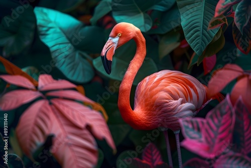 Obraz premium Vibrant Pink Flamingo Amidst Lush Tropical Foliage