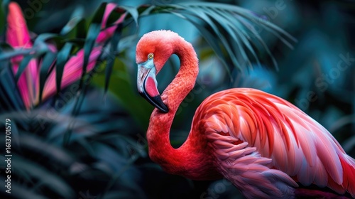 © Juhamsir, Fototapeta premium Vibrant pink flamingo preens its feathers amidst lush, dark green tropical foliage; its elegant neck curved, eye sharp