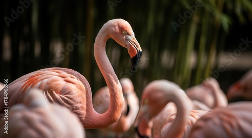 Obraz premium Vibrant pink flamingo standing out from the flock. Detailed close up of an elegant bird's head and curved neck. Exotic wildlife in a natural habitat. Zoological and conservation concept