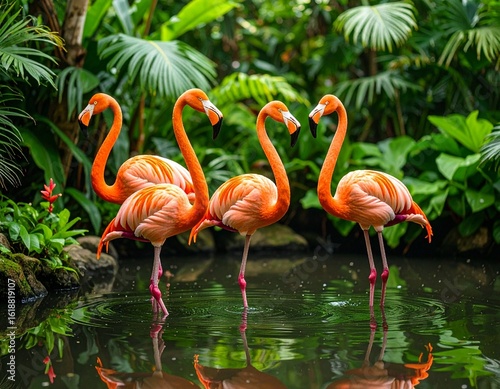 © Shoaib, Fototapeta premium Vibrant Pink Flamingos in Tropical Water – Exotic Birds in Lush Green Habitat
