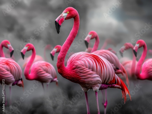 © authapol, Fototapeta premium Vibrant Pink Flamingos Standing Gracefully in a Grayscale Marsh Landscape with Soft Fog, Highlighting Their Unique Beauty and Flamboyant Feathers