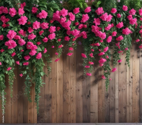 © แสงเดือน สุขทั่วญาติ, Fototapeta premium Vibrant pink floral banner with lush greenery and intricate flowers draped across a rustic wooden wall, banner, home decor