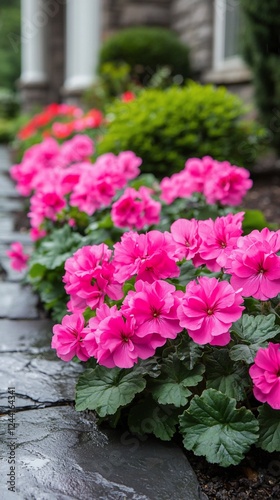 © Amron, Fototapeta premium Vibrant pink flowers blooming in a garden border.