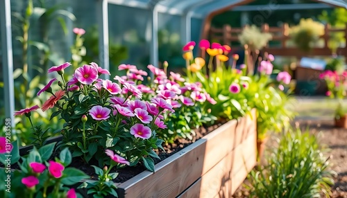 © ChaokuayOfficial, Fototapeta premium Vibrant Pink Flowers Blooming in a Sunlit Greenhouse Garden with Lush Vegetation Background