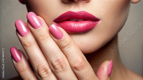 © Wanlop, Obraz premium Vibrant pink hues adorn a solitary, elegant hand featuring flawless nails and lips, set against a neutral, blurred background.