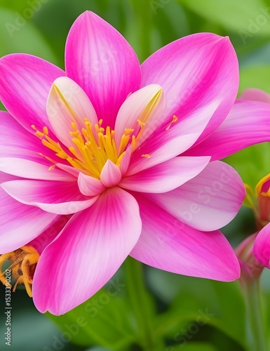 © MDMahdi, Fototapeta premium Vibrant Pink Lotus-Inspired Bloom with Yellow Stamens on Green Background