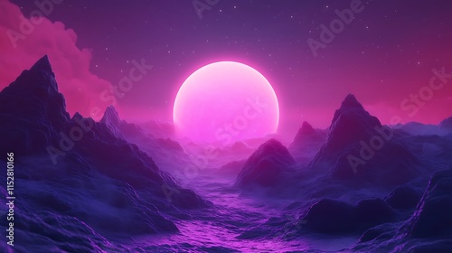 © heinng, Fototapeta premium Vibrant Pink Moon Rises Over Enchanting Mountains: Digital Painting in a Futuristic Style. AI Generated