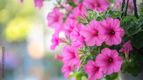 Fototapeta premium Vibrant pink petunia flowers cascading from a hanging basket on a sunlit...