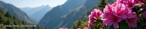 © Teepanun, Fototapeta premium Vibrant pink rhododendron flowers bloom against a rocky mountain backdrop, backdrop, flowers
