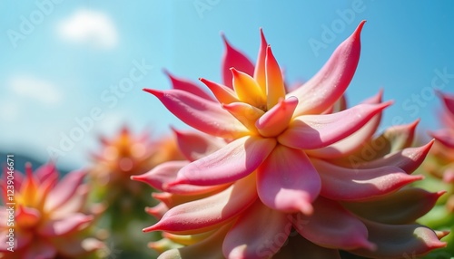 Fototapeta premium Vibrant pink succulent in sunlight with blue sky background, nature's beauty symbol