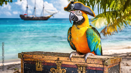 Fototapeta premium Vibrant pirate parrot on treasure chest by ocean. concept of adventure,...