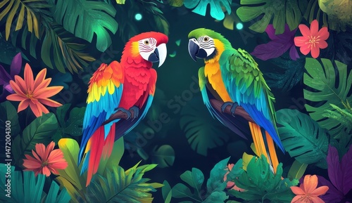 © Riz, Obraz premium Vibrant Pixel Art Featuring Two Macaws Perched on Branches Surrounded by Lush Tropical Foliage and Exotic Flowers in Deep Green Background