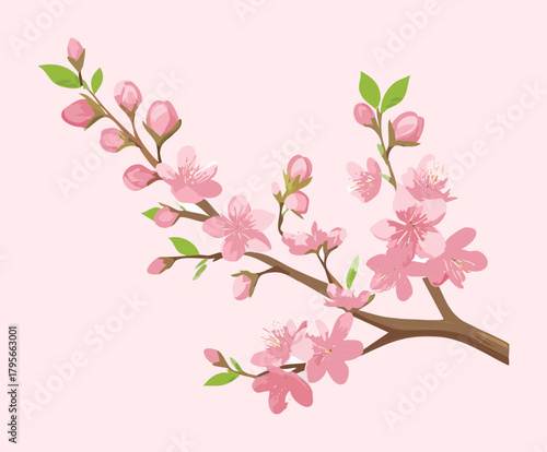 Naklejka premium Vibrant Plant Pink Cherry Tree Branch with Flowers and Buds on a Pale Canvas...