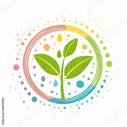 © MILYARDER1414, Obraz premium Vibrant plant sprout with colorful circular frame and scattered dots on a white background, symbolizing growth and nature.