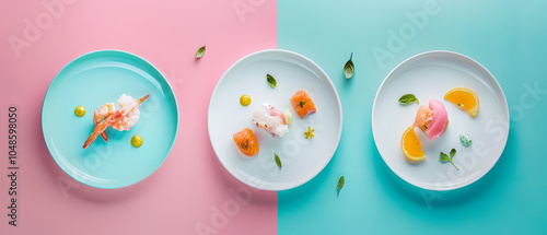 Fototapeta premium Vibrant plates, each adorned with unique colors and garnishes, illusion of...