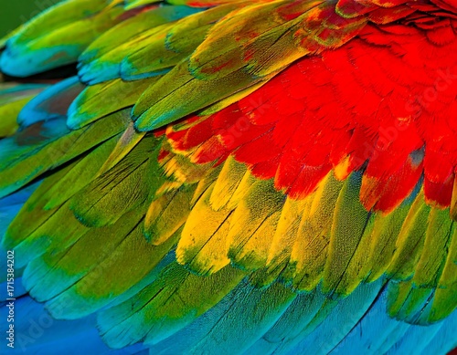 Obraz premium Vibrant plumage; red, yellow, green, and blue feathers overlap