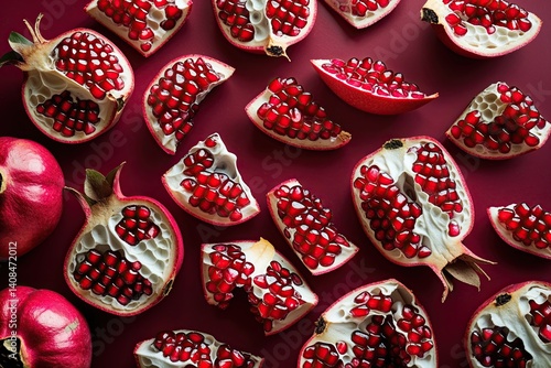 © Michael, Fototapeta premium Vibrant Pomegranate Segments Against Lush Ruby Background Showcasing Juicy Tropical Elegance and Unique Texture
