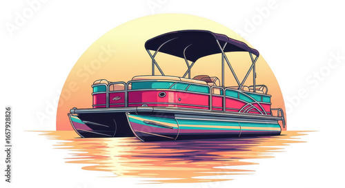 Naklejka premium Vibrant pontoon boat moored on calm water reflecting sunset colors during...