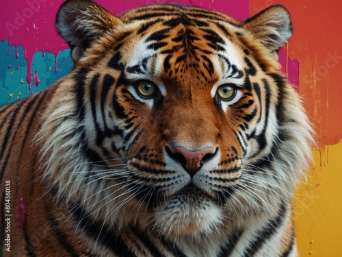 Naklejka premium Vibrant Pop Art Tiger Portrait - Abstract Graffiti Animal Design