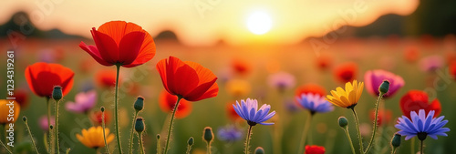 © Galeno, Obraz premium vibrant poppies cornflowers dance together warm sunset meadow full