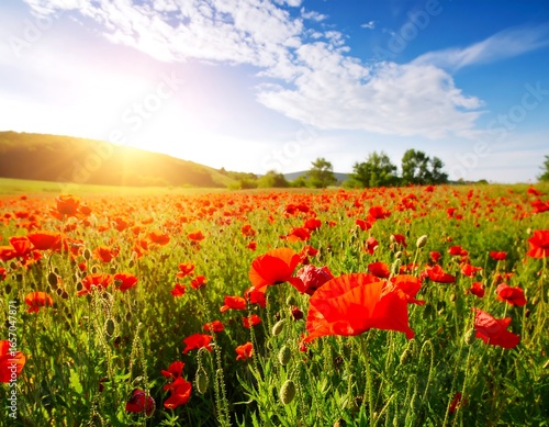 © Deni, Fototapeta premium Vibrant poppy field at sunrise