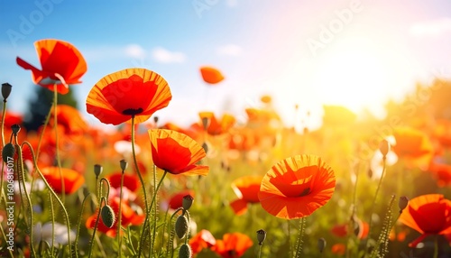 Naklejka premium Vibrant poppy field bathed in sunlight