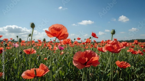 Naklejka premium Vibrant poppy flowers spreading across a sunny summer field
