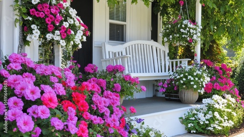 Fototapeta premium Vibrant porch overflowing with colorful flowers and plants.