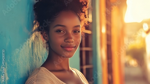 Fototapeta premium Vibrant portrait of a confident young woman in Cuba. Soft warm sunlight and...