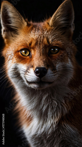 Fototapeta premium Vibrant portrait of an orange fox in professional shot with intense dark...