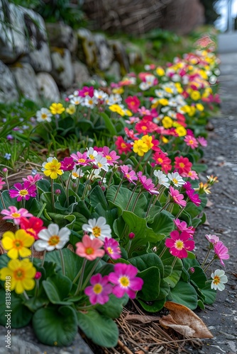 © pkproject, Fototapeta premium Vibrant Primula Blossoms Lining a Peaceful Garden Path