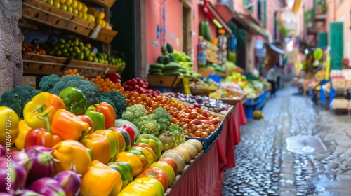 Fototapeta premium Vibrant produce spills out onto the tables at a bustling outdoor market,...