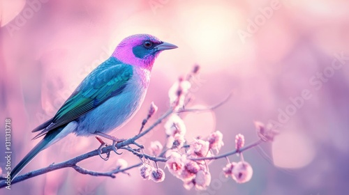 © harryaishi, Fototapeta premium Vibrant purple and blue bird perched on a flowering branch at sunrise.