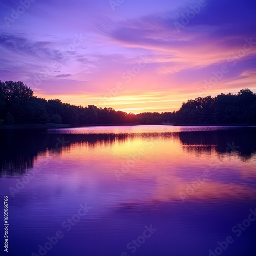 Fototapeta premium Vibrant purple and orange sunset over a calm lake with reflections of the sky...