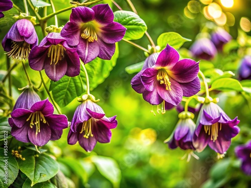 © Adisorn, Fototapeta premium Vibrant purple Cobaea scandens flowers bloom on a lush green vine, showcasing delicate, intricate details and soft, romantic lighting in a whimsical outdoor setting.