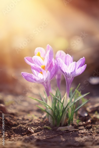 Naklejka premium Vibrant purple crocus flowers blooming in sunlit garden