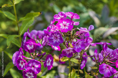 Fototapeta premium Vibrant purple flowers blooming in a lush garden during sunny spring days