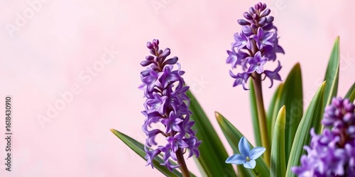 © Poom, Fototapeta premium Vibrant purple hyacinths bloom in corner of soft pink & blue spring backdrop, spring flowers, bright