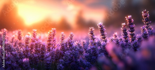 © NE97, Naklejka premium Vibrant purple lavender field at sunset. Serene landscape with bokeh, soft light, & subtle breeze. Ideal for peaceful designs, spring promotions, or floral themes.