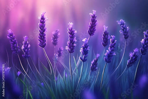© khamz, Naklejka premium Vibrant Purple Lavender Flowers Soft Sunset Background