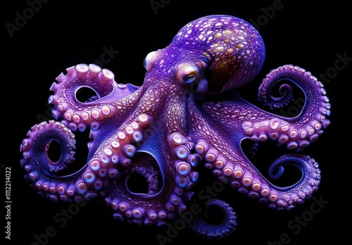 © ANUAR, Obraz premium Vibrant Purple Octopus Displaying Intricate Patterns and Texture on Its Body Amidst a Black Background, Showcasing Marine Beauty and Intelligence