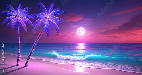 © Mahmod, Naklejka premium Vibrant purple palm trees on a neon beach at sunset with glowing ocean waves
