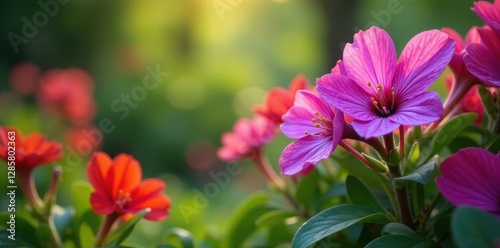 © Duangjai, Fototapeta premium Vibrant purple & red spring blooms in lush garden , natural light, landscape